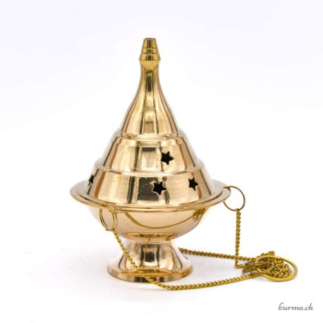 Brûleur pour résines, gommes, encens et plantes avec suspension en bronze doré. Grâce à sa suspension par lequel il peut être tenu et déplacé sans risque de se brûler, cet encensoir est parfait pour le nettoyage énergétique des lieux.