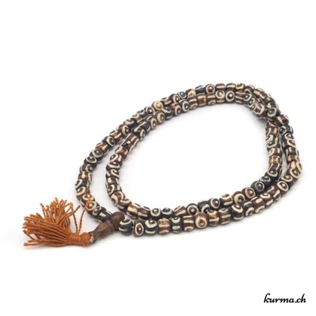 Ce mala en os sort de l’ordinaire avec ses gravures blanches figurant des yeux bruns. Sa fabrication est artisanale et il vient directement du Népal.